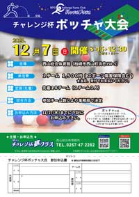 スポーツイベント事業 チャレンジ杯 ボッチャ大会 種目 / ボッチャ ヨーロッパ生まれのパラリンピック正式種目。老若男女とわず、誰にでもできるスポーツです! < 基本情報 > 対象 : 小学生以上 日程 :2025年12月7日(日) 場所 : 西山総合体育館アリーナ 参加費 :1チーム / 1,500円 募集チラシ